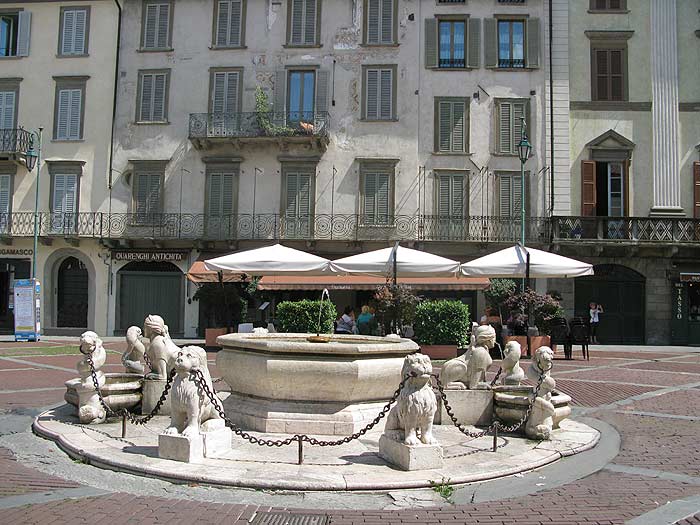 La ville haute, entourée de remparts (demeurés intacts depuis le XVIe siècle), est reliée à sa sœur inférieure par un funiculaire. Recueillons-nous, en souriant : c’est à Bergame qu’est née la Commedia dell’arte, que Pierrot, Colombine, Arlequin, Scapin, Scaramouche et Pantalon ont commencé leur carrière immense. Il reste dans cet écrin lombard quelques bijoux, sertis tout autour de la Piazza Vecchia, dominée par la Torre Civica, du XIIème siècle. La Piazza, par beau temps, vous invite à la flânerie : comme elle n’est pas très grande, on peut s’installer et manger ou boire à la santé des personnages cités plus haut, et contempler le palais de la Ragione, qui arbore au-dessus de son portait le lion de Venise, vestige de la domination qu’a exercée la Sérénissime sur la ville.