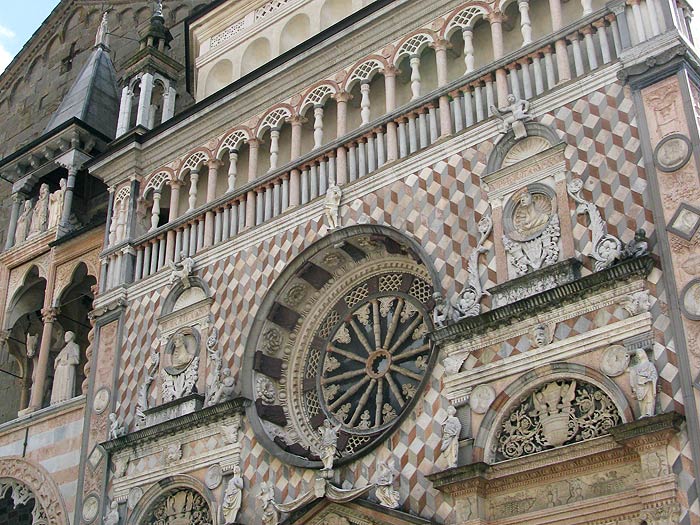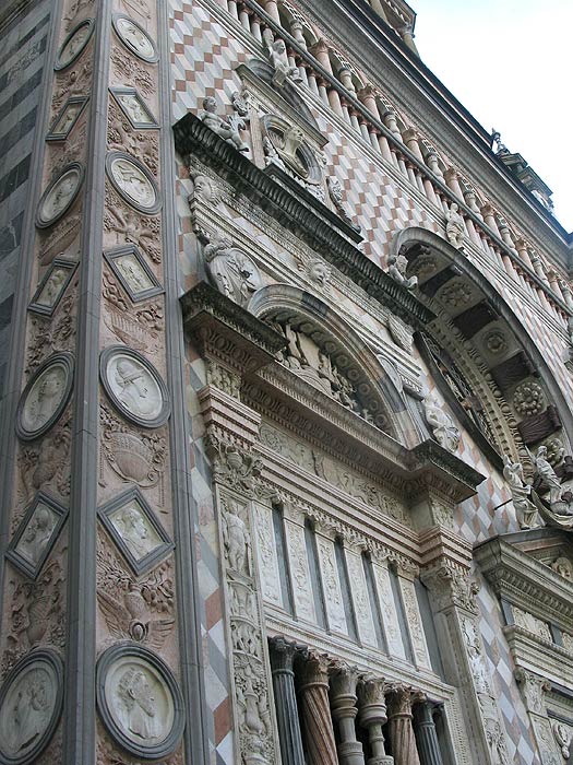 En passant sous les arcades du palais, vous découvrez, collées l’une à l’autre, la Cappella Colleoni et la basilique Santa Maria Maggiore. La Capella a été conçue par Amadeo, l’architecte de ce chef-d’œuvre absolu qu’est la Chartreuse de Pavie. La façade dotée de marbres polychromes porte sa marque. L’intérieur est fastueux, avec ses stalles en marqueterie, ses fresques de Tiepolo, et le monument de Colleoni (le Condottiere Bartolomeo Colleoni) est l’œuvre d’Amadeo. Vous ressortez, et quelque deux mètres à votre droite vous admirez le porche du XIVème siècle de la Basilique Santa Maria Maggiore, ses piliers reposant sur des lions. A l’intérieur, vous découvrez de superbes tapisseries, qu’elles soient florentines ou flamande, pour celle qui se trouve au fond de la nef. Enfin, de magnifiques panneaux de marqueterie, dans la balustrade du chœur, vous décrivent l’Ancien Testament.