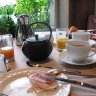 Galerie photos 2 : le buffet du petit-déjeuner dans la salle à manger du Montaigu et le bar dans les anciennes écuries du château.