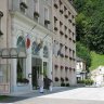 A gauche : Le Grand Hôtel : l'entrée sur la place Déesse Hygie, face au casino. A droite : les Thermes d'Uriage-Les-Bains, reliés au spa du Grand Hôtel