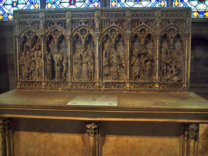 Tombeaux et gisants dans le transept nord. Au premier plan, le tombeau monumental, orné de sculptures de Germain Pilon (1560-1573), de Henri II et Catherine de Médicis.